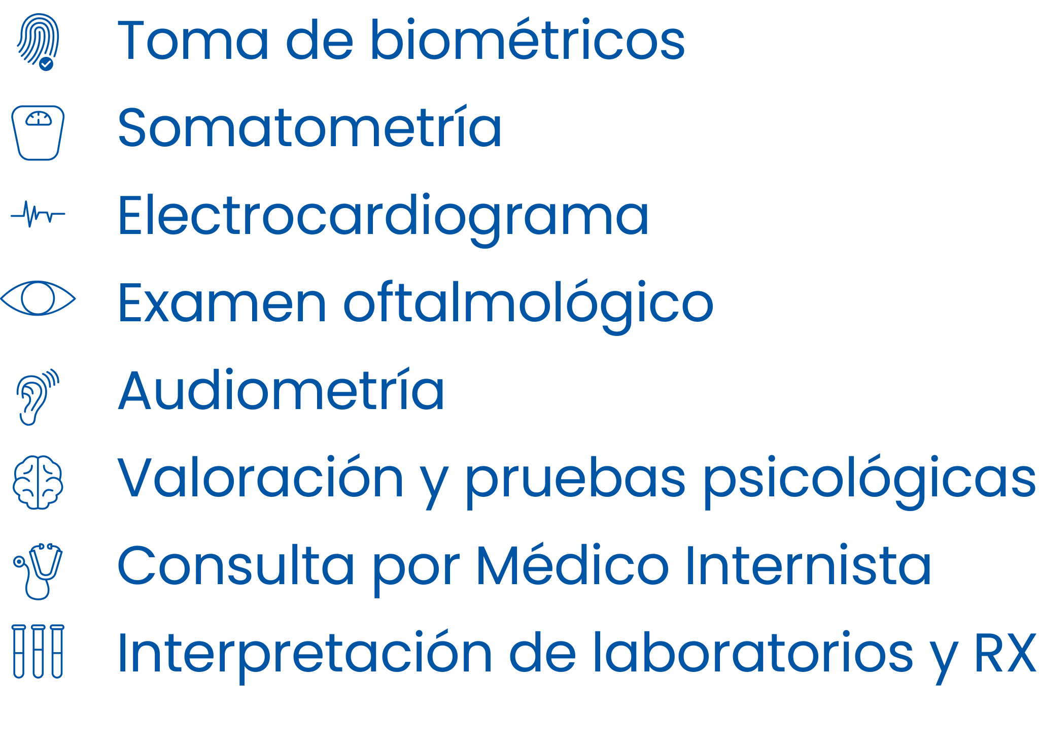 Para la elaboración de las evaluaciones médicas es necesario presentarse en nuestras instalaciones con estudios de laboratorio y radiografía de tórax con una emisión no mayor a un mes de la cita programada.